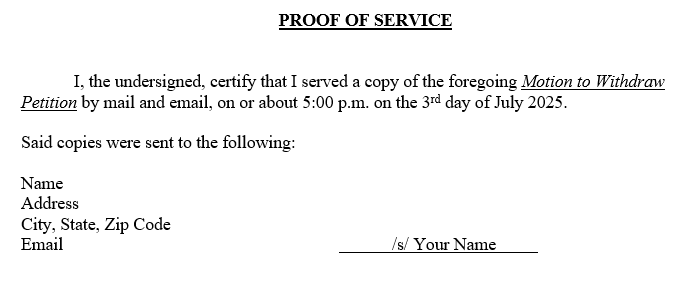 Motions also typically require a proof of service to show you sent the motion to your spouse. Your proof of service should look something like this: