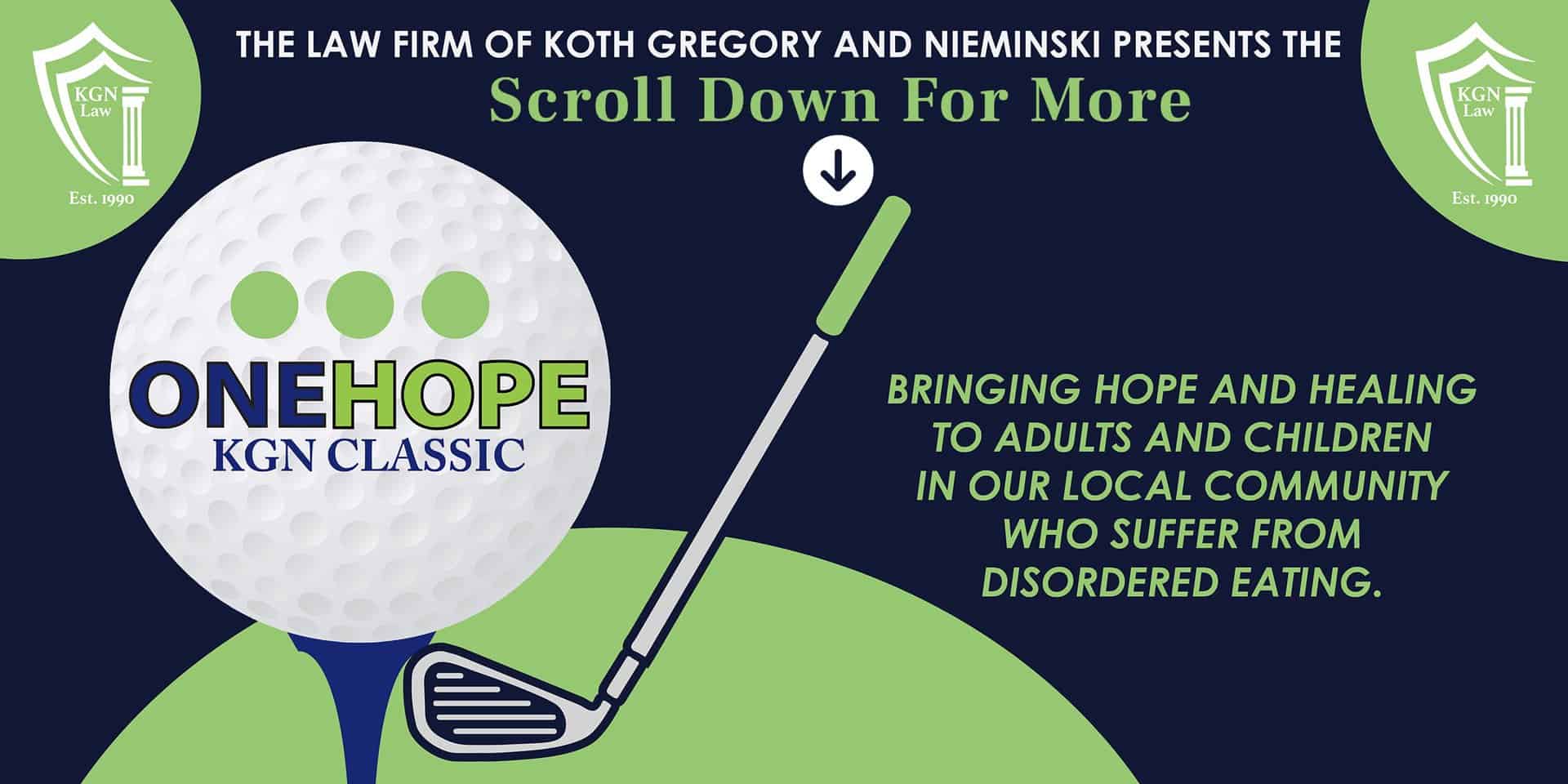 What: Charity Golf Outing hosted by Koth Gregory & Nieminski with proceeds going to the One Hope Project. Lunch and Dinner provided by local Bloomington-Normal fan favorites. We are proud to announce that many of the event sponsors are businesses from our community so you can feel good knowing that your time and money are going towards a local charity supported by local businesses. The event includes golf, cart, lunch, dinner, soft drinks, contests, and prizes. Join us for a fun afternoon supporting a good local cause.